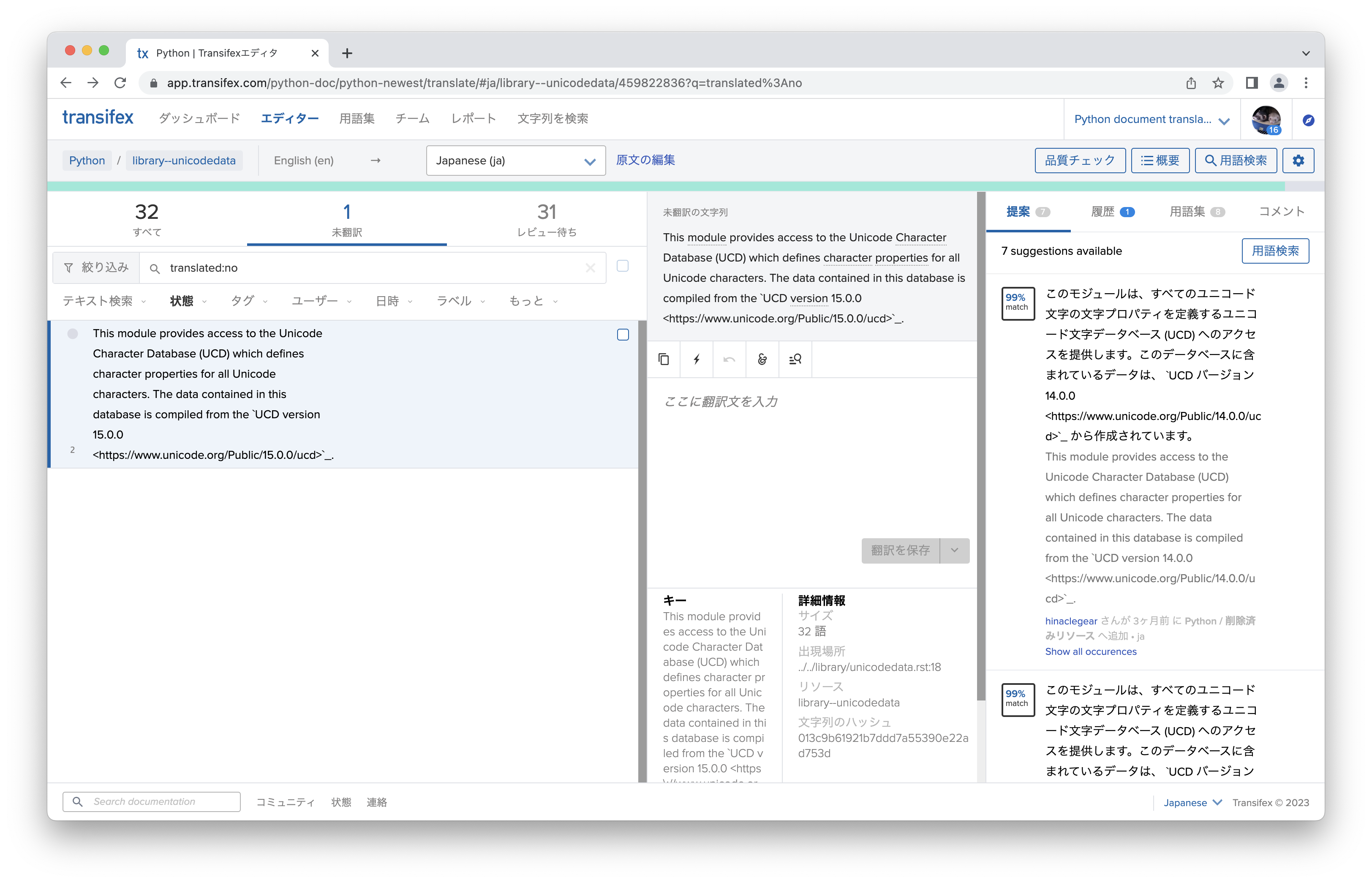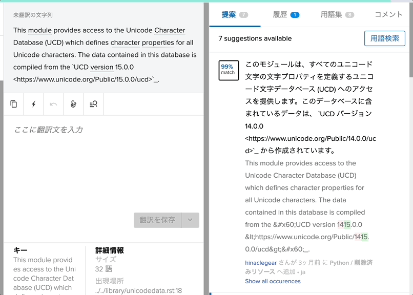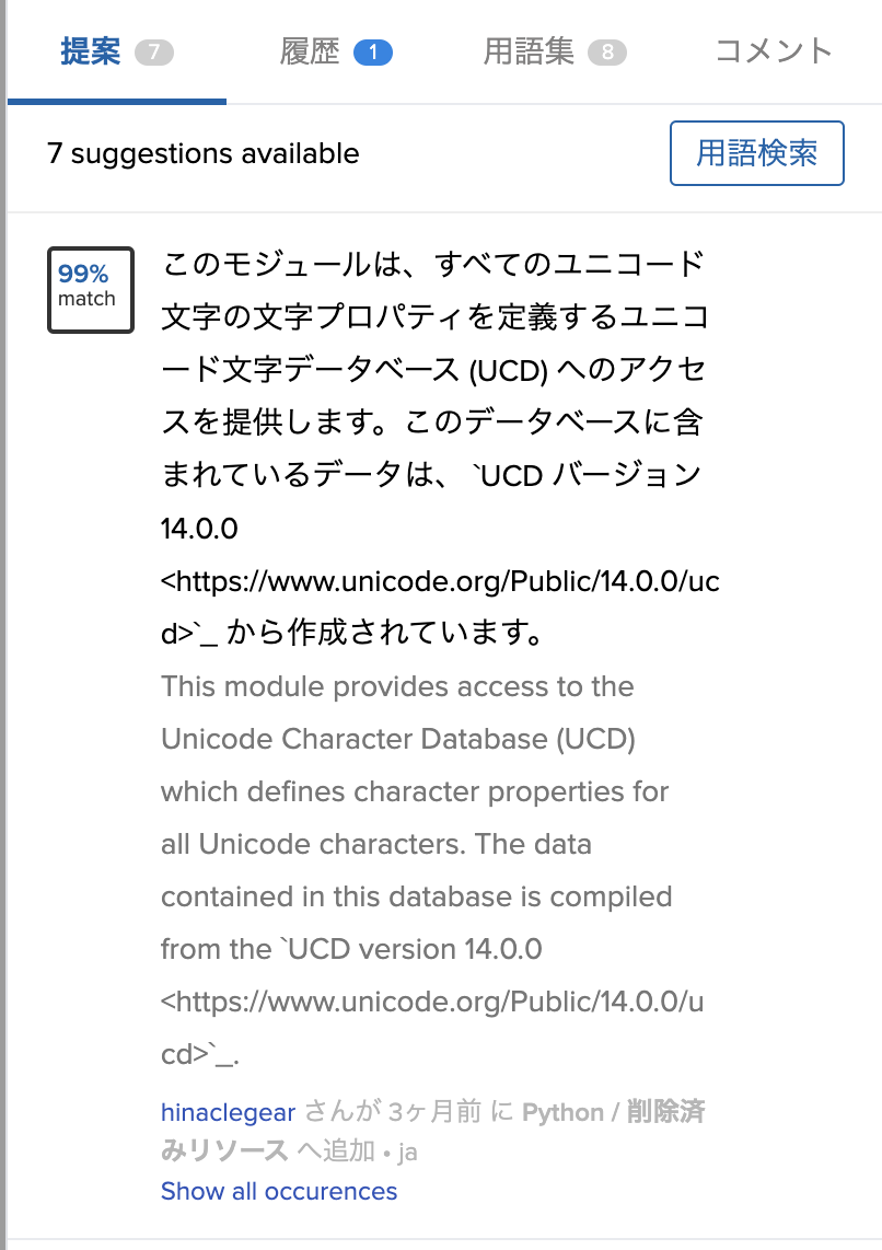 ここでは標準ライブラリのunicodedataを例に見てみます。 翻訳リソースの未翻訳を見てると、1つだけ未翻訳があります。 原文は以下の内容です。