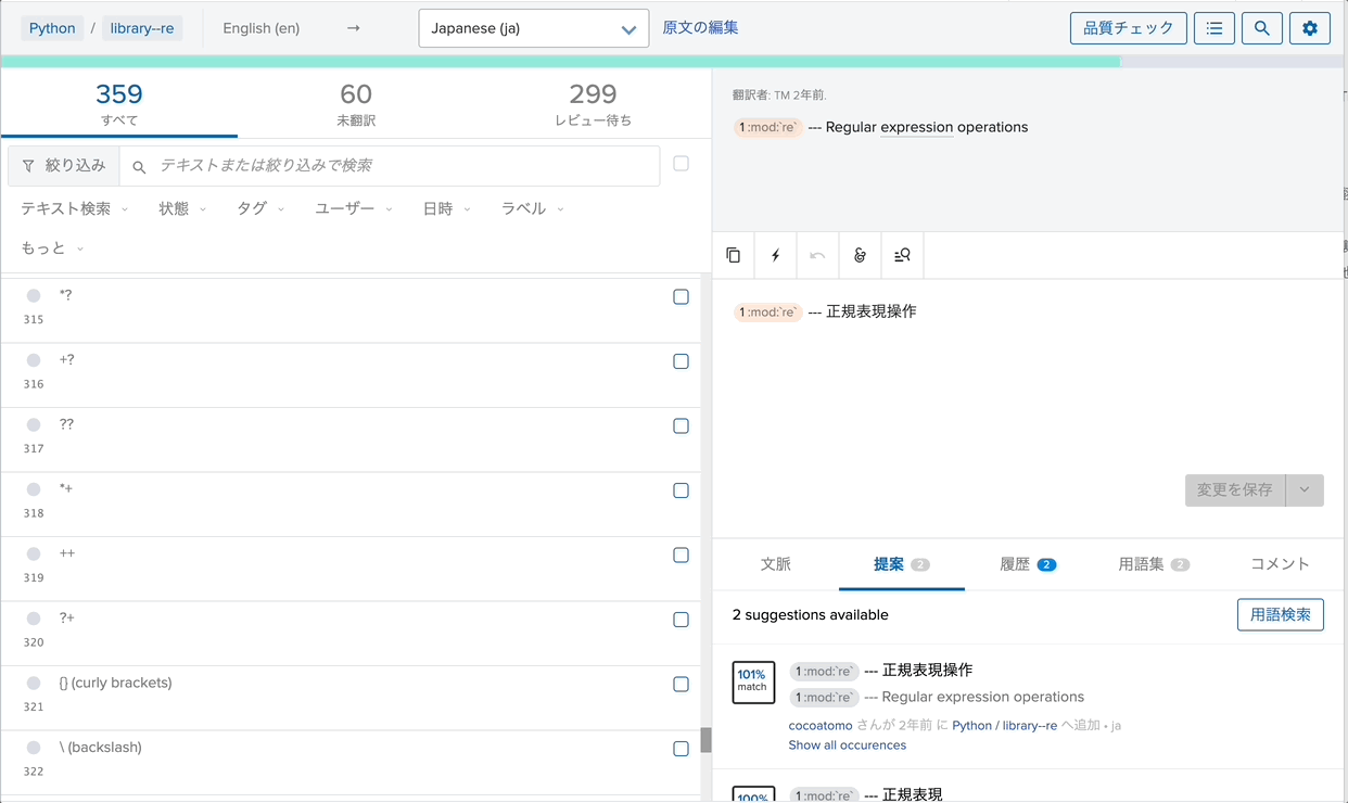 Transifexには、翻訳を進める上で便利な機能があります。 いくつかその機能と操作方法を紹介します。