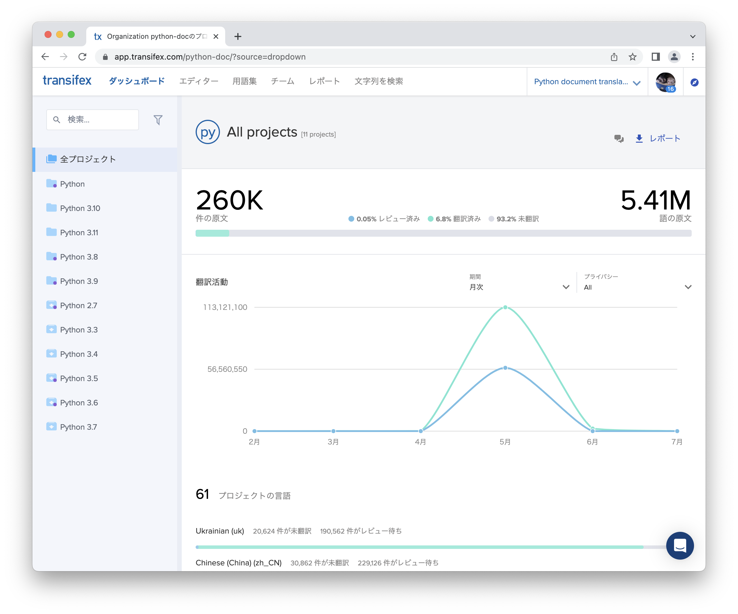 するとPythonの公式ドキュメント翻訳の組織に移動します。 画面の左側にPythonバージョンごとにプロジェクトがわかれているので、翻訳対象のバージョンを選択します。 2023年8月現在は「Python」を選択するとPython 3.12の公式ドキュメントが対象になります。 ここでは「Python」を選択します。