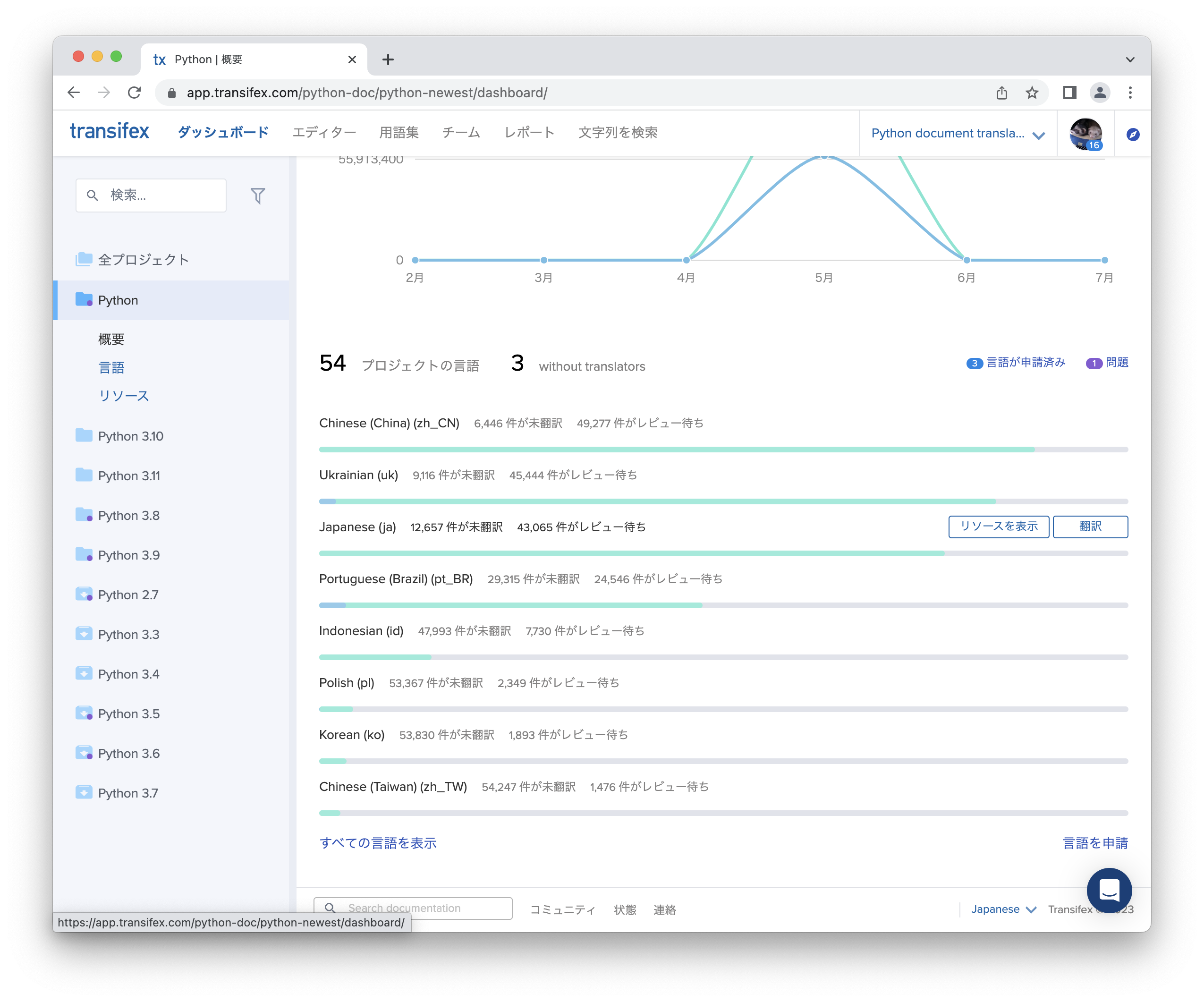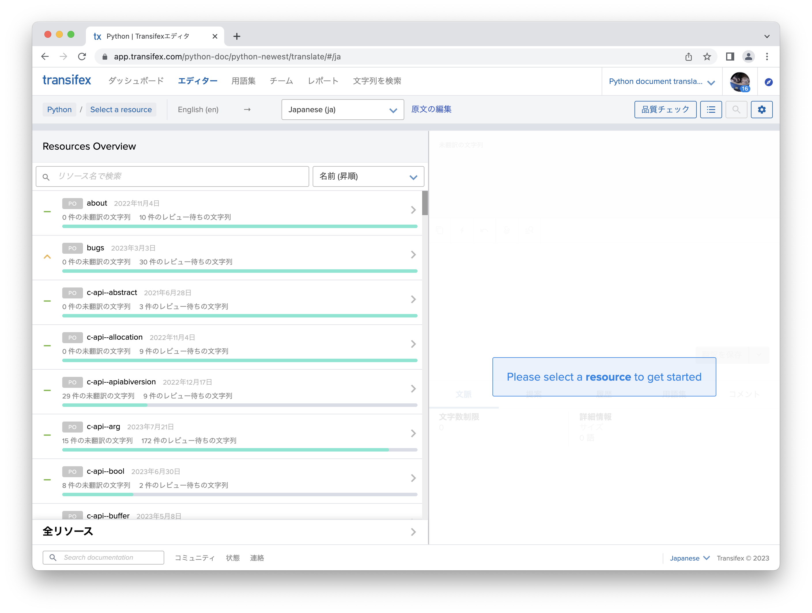リソース一覧画面では、選択したプロジェクト(ここではPython)の翻訳リソースの一覧が表示されます。 「about」「bugs」「c-api--abstract」などがありますが、これはPython公式ドキュメントのファイル名と対応しています。 例にあげた3つのリソースは、それぞれ以下のページと対応しています。