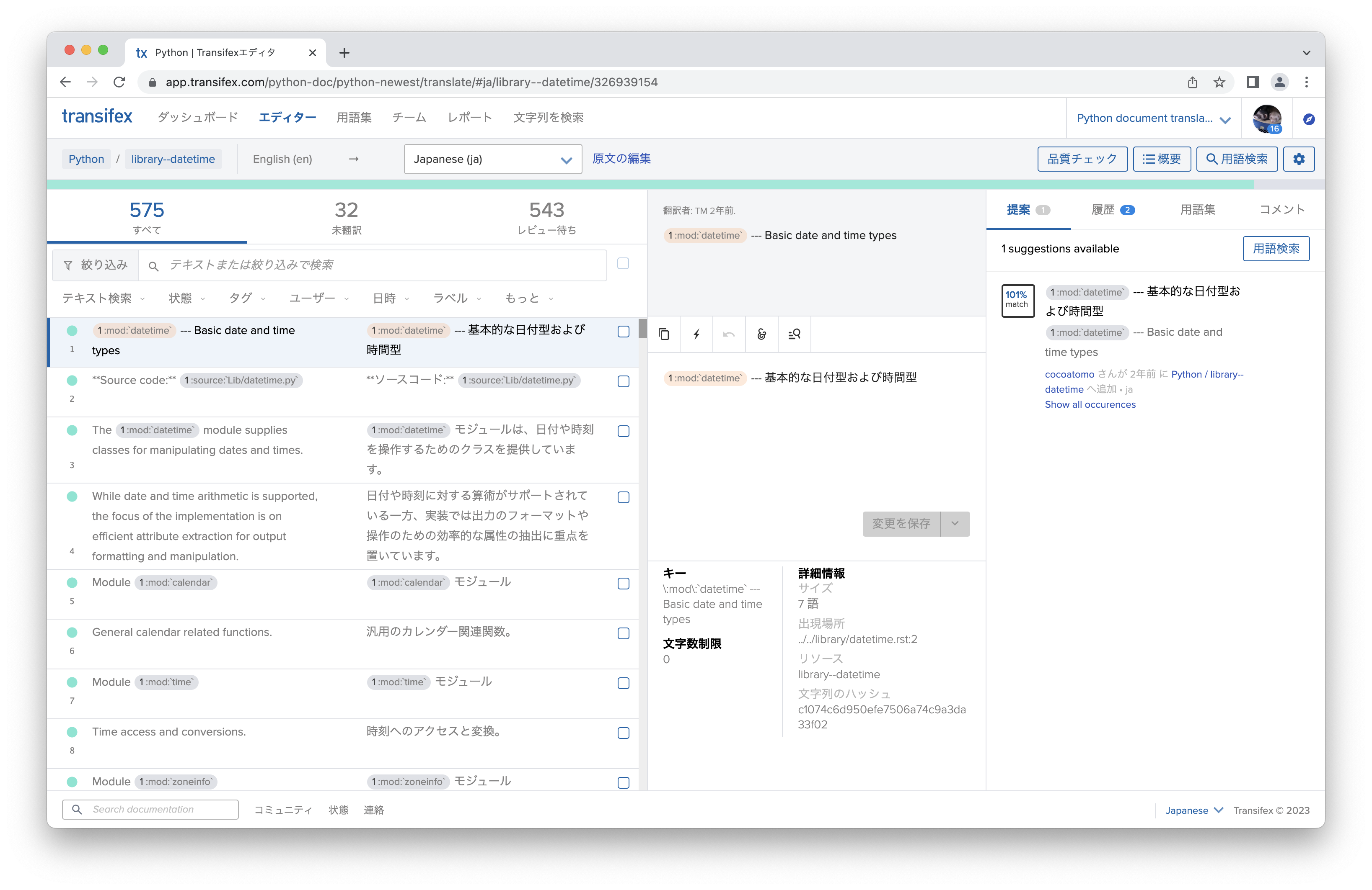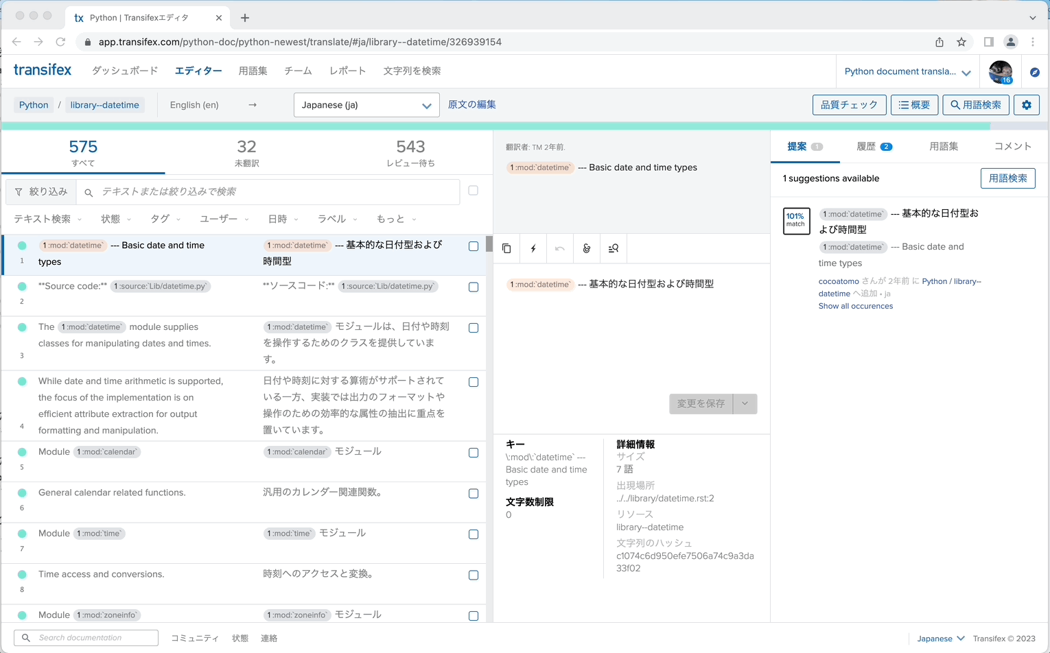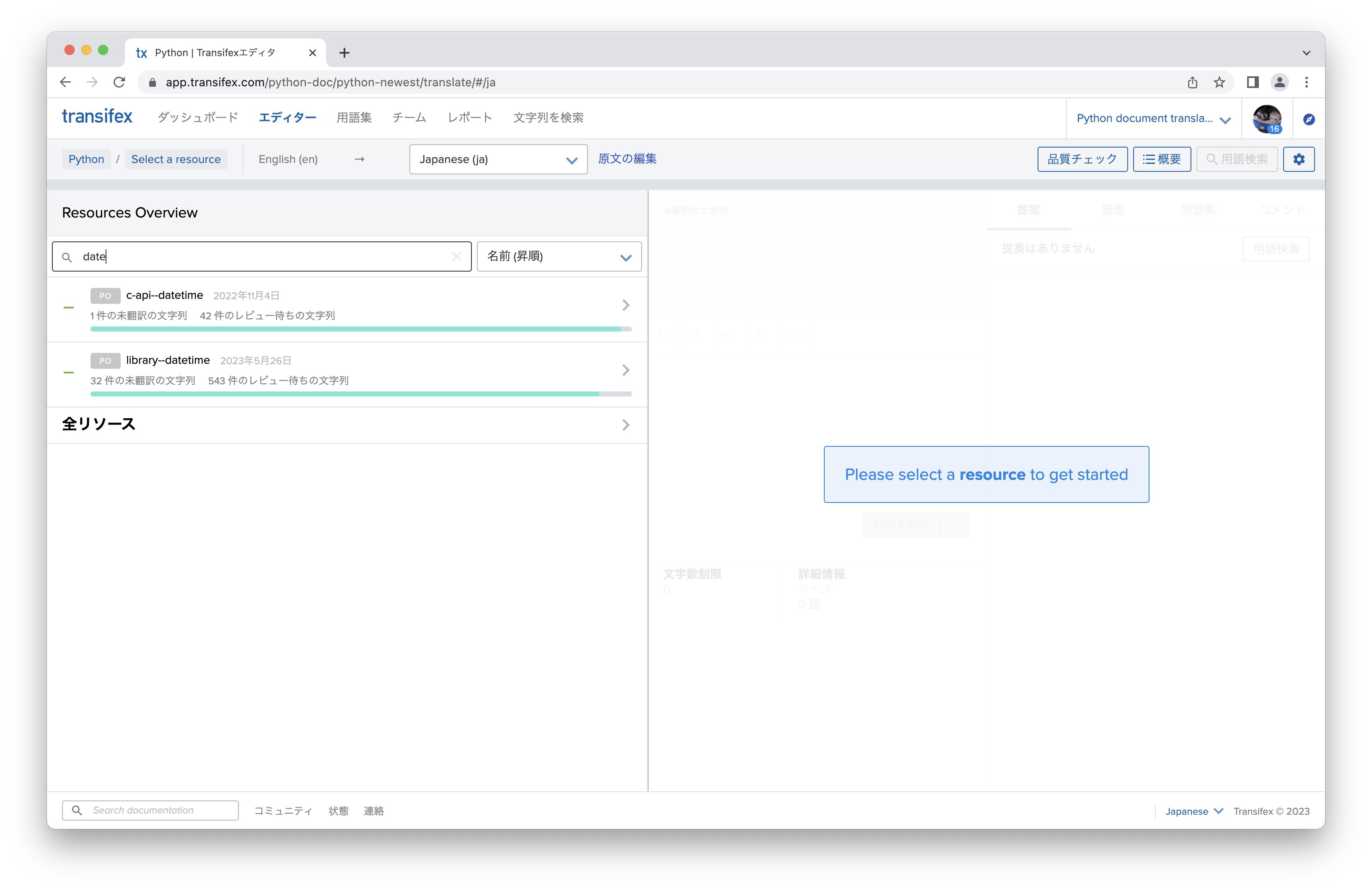 ここでは標準ライブラリのdatetimeのドキュメントを翻訳してみたいと思います。 検索ボックスに文字列を入力するとリソースを名前で絞り込めます。 「library--datetime」が対象のリソースなのでクリックします。