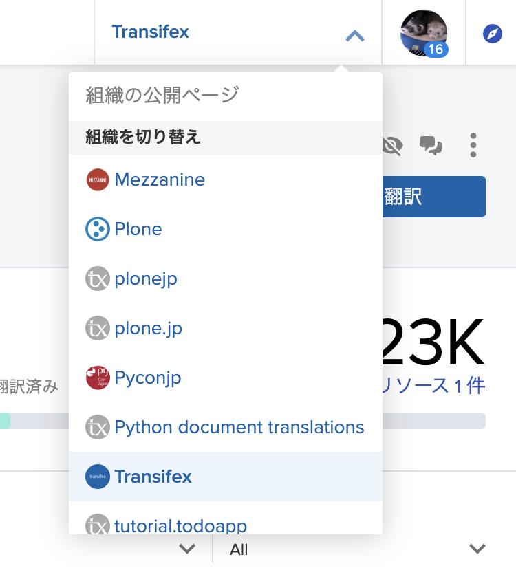 ログインすると右上に翻訳の組織(プロジェクトのようなもの)が切り替えられるようになっています。