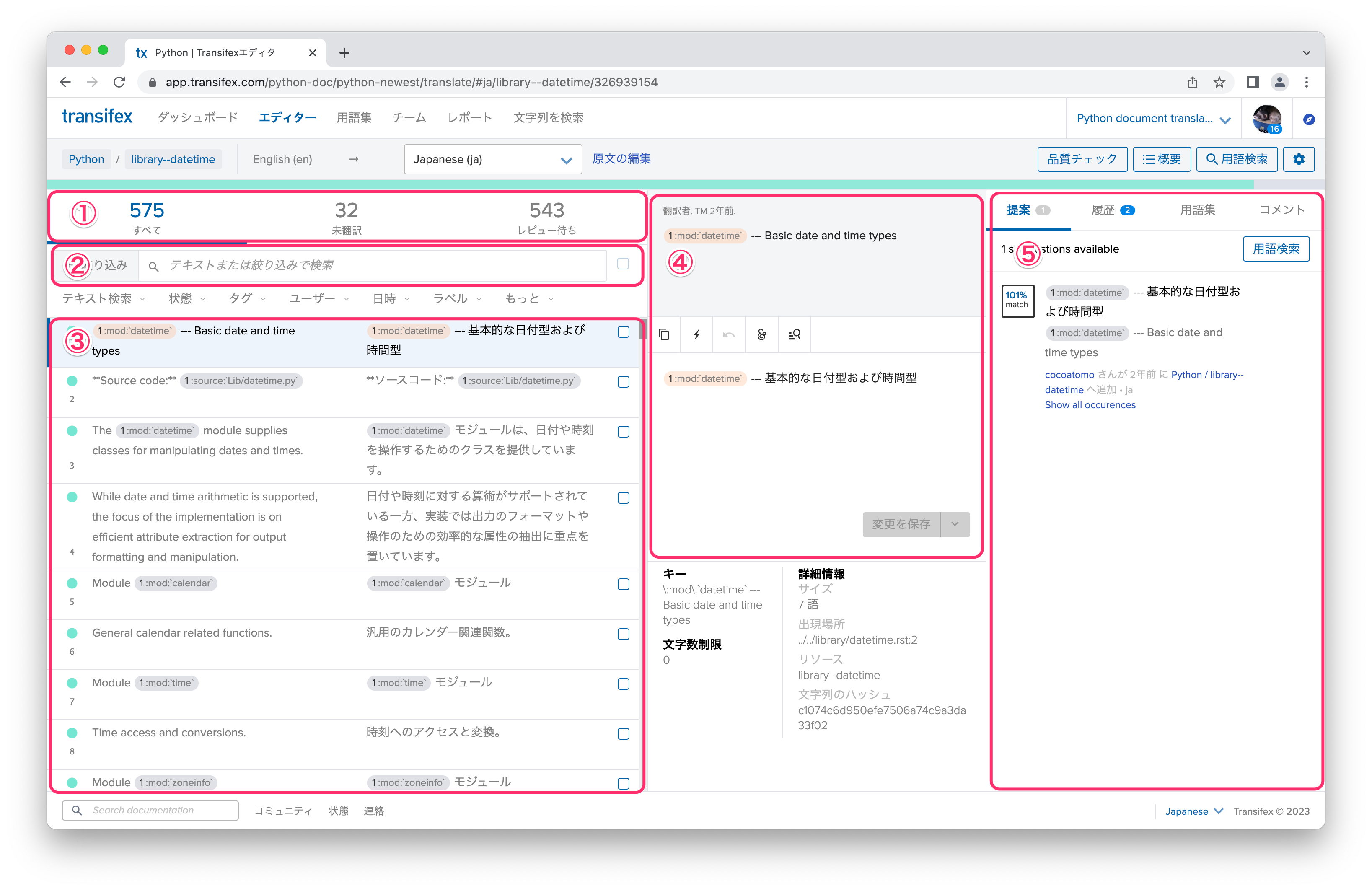 翻訳画面でよく使う要素としては以下のものがあります。 なお、各要素に付けている名前は私が便宜上付けた名前で、Transifexの公式の名前ではありません。