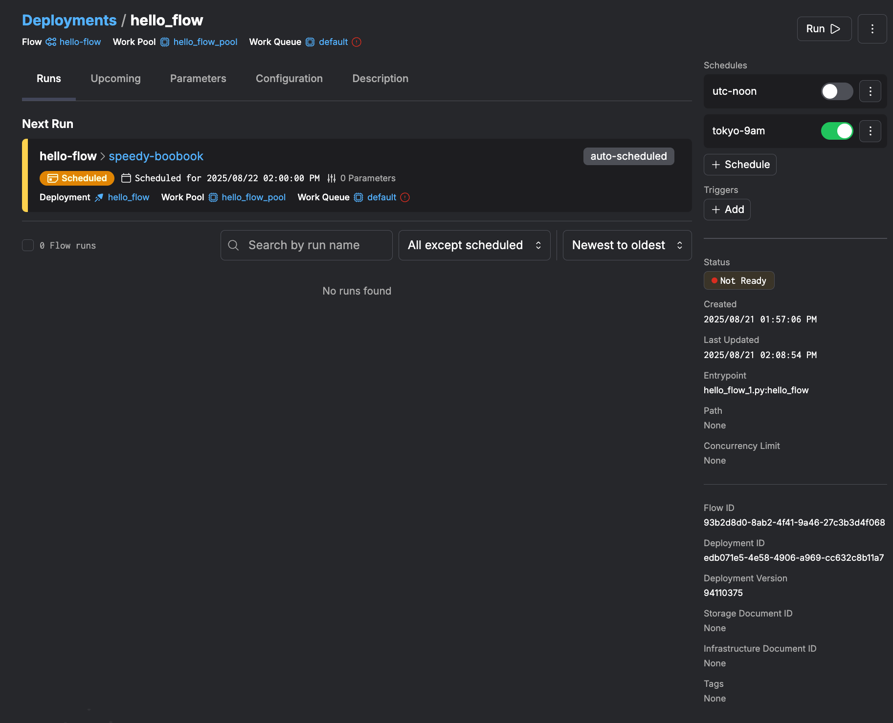 Web UIからもわかるように、指定したフローがprefect.yamlの設定内容に従ってスケジュールされています。 また、画面右上には手動で実行するための「Run」ボタンが配置されており、スケジュールの有効/無効を切り替えることもできます。